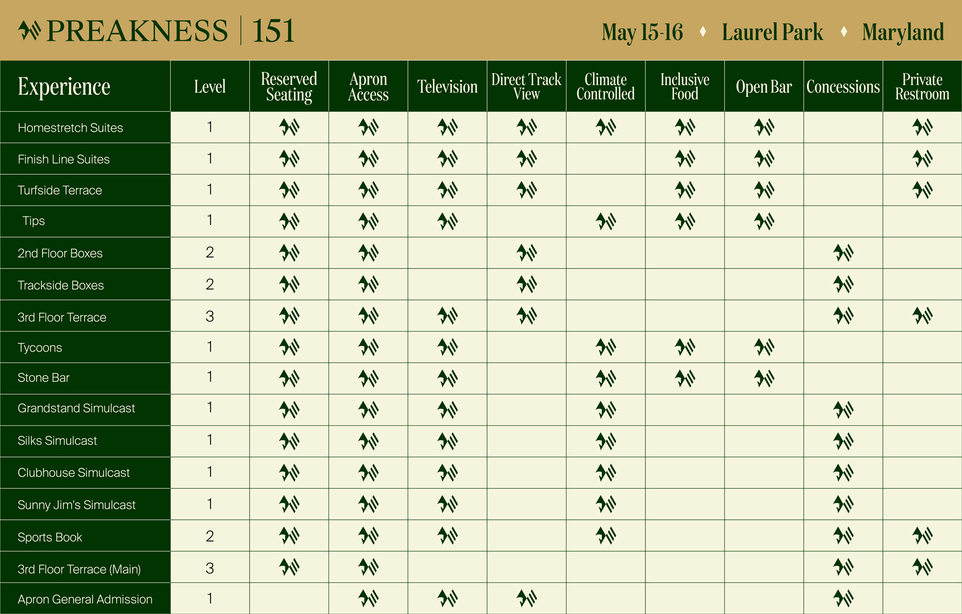 Experience Preakness 151 from a covered open-air suite overlooking the finish line. Perfectly positioned for exceptional race views, these premium suites feature VIP preferred parking, flat-screen TVs, executive restrooms, a private suite attendant, complimentary race day programs, and convenient access to mutuel clerks and self-service betting options for a seamless race day experience. Please contact info@preakness.com to book your suite experience today. This seating experience offers track views.